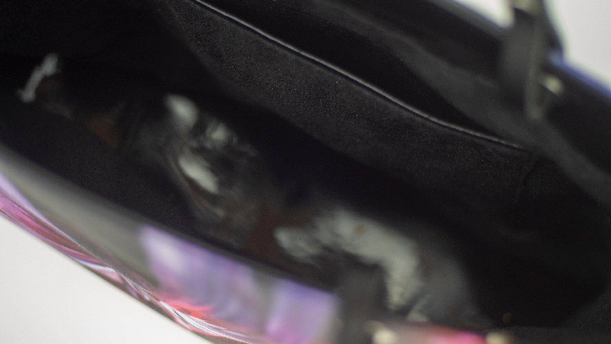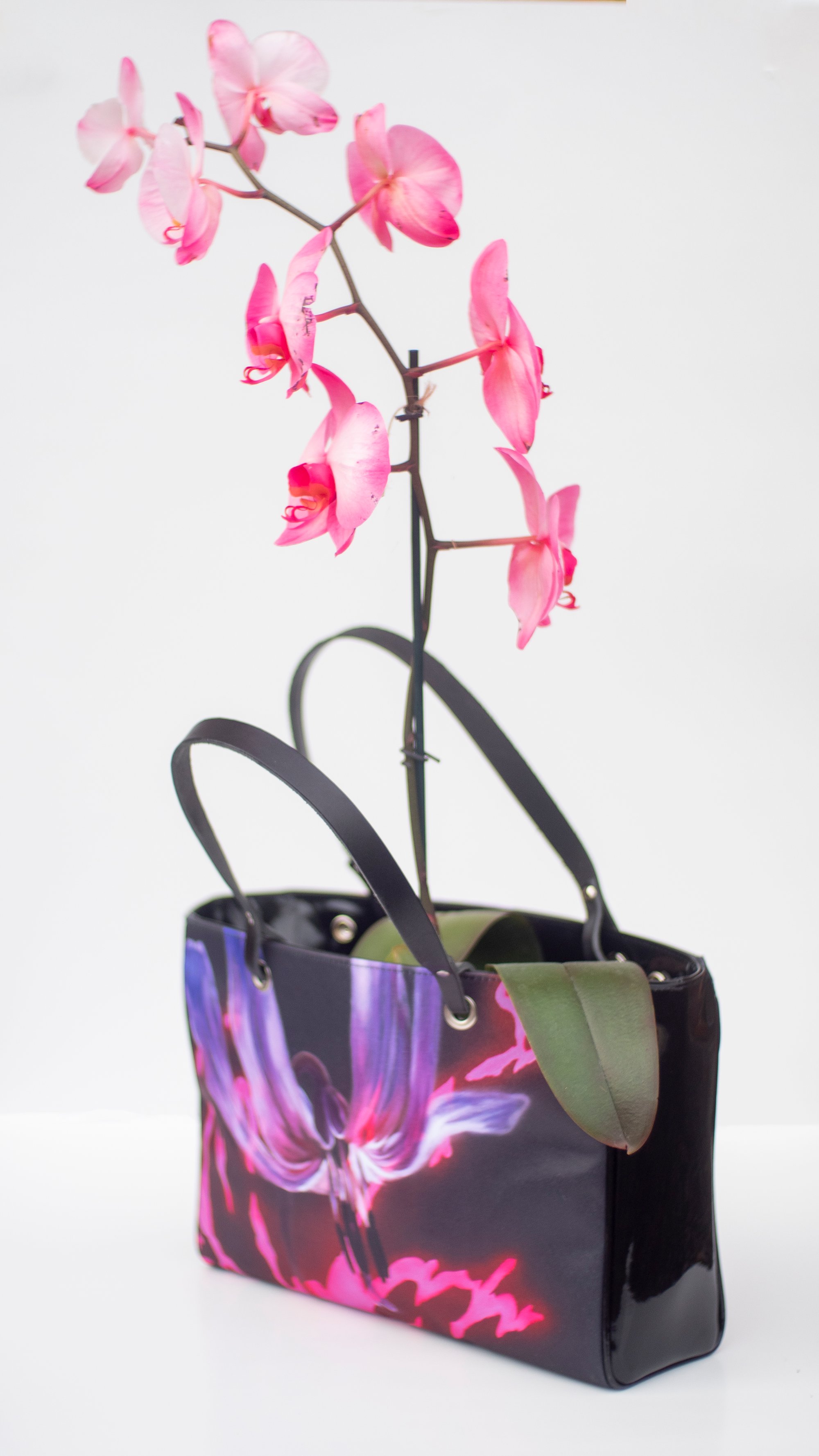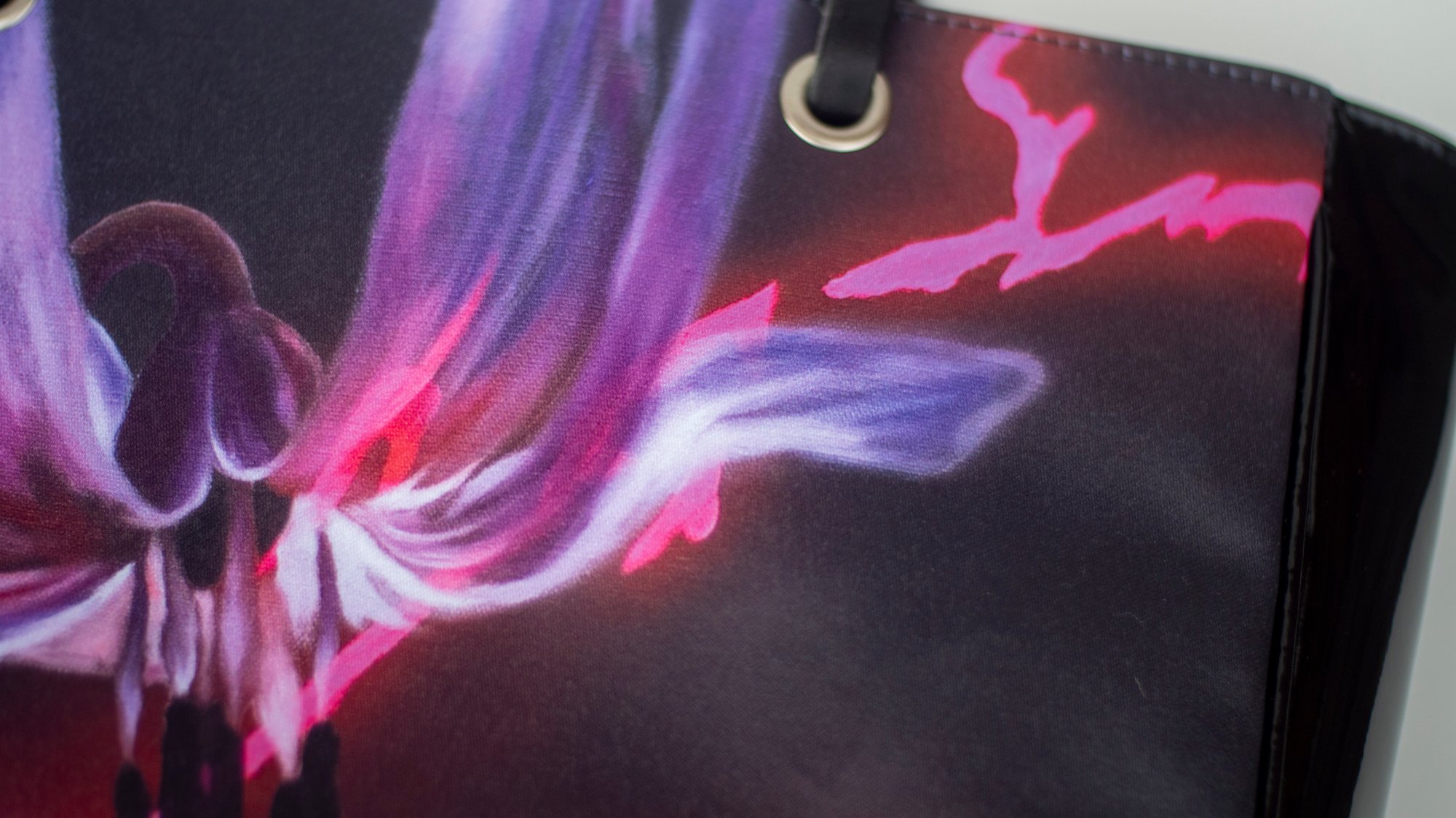 Although larger than a standard clutch, it is still lightweight enough to carry comfortably in your hand on under your arm. Artwork is printed on a beautiful satin fabric, which makes the front and back of the bag. Crafted with a luxurious faux suede lining and leather handles. You have the option to choose from glossy vinyl The bag is kept closed by a double press stud.